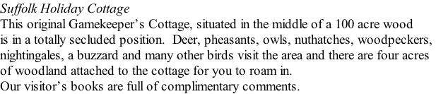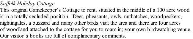 Click to see local attractions Welcome to Gamekeeper’s Cottage - a unique self-catering holiday cottage in Suffolk